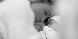 На чорно-білих фото Періс у сукні-комбінації, а потім у білому кашеміровому светрі, діамантових сережках, з масивним перснем на пальці та при повному макіяжі та з зачіскою притискає до себе тримісячного малюка, обіймає його та схиляється над ним.