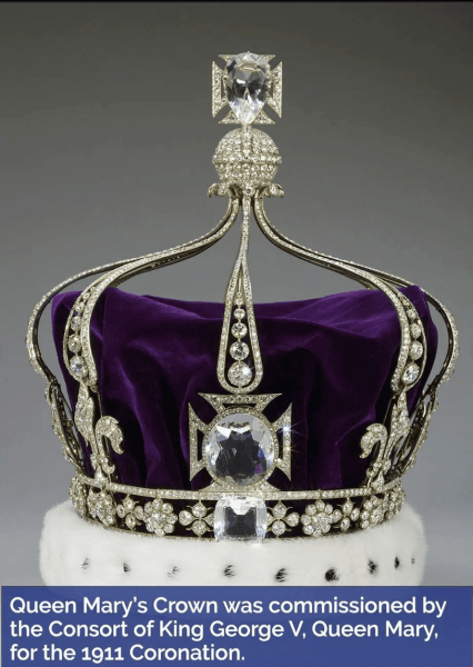 Камілла одягне корону королеви Марії, хоч і з деякими змінами. Додавання діамантів Cullinan III, IV і V, які належали покійній королеві Єлизаветі II (вона часто носила їх як брошки), є першою ознакою того, що її стиль на коронації може бути натяком і пошаною покійній королеві. Для більш актуального зовнішнього вигляду Камілла могла також видалити арки з культового виробу будинку Garrard, одягнувши його як обруч поверх зачіски. Так зробила королева Марія на коронації короля Георга VI в 1937 році.