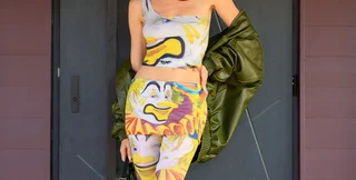 Окрім химерної перуки, зірка обрала яскравий костюм із "клоунським" принтом, що складається з топу на одне плече, мініспідниці та колготок. Фокс доповнила свій образ білими туфлями без задника з хутряним оздобленням і сховала все необхідне в пухнасту темно-зелену сумочку. Вона завершила екстравагантний ансамбль мішкуватою зеленою курткою-бомбером.
