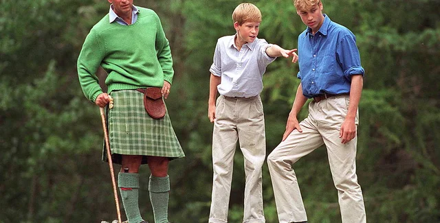 У той час як король був одягнений у традиційно шотландське вбрання з яскраво-зеленого в'язаного светра та кілта в зелену клітку, Вільям і Гаррі вибрали світло-коричневі штани та сорочки із закоченими рукавами. Усі троє, здавалося, дивилися на щось, на що Гаррі показує за кадром.