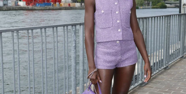 На знаменитості був блискучий твідовий костюм, що складався з лавандового жакета без рукавів із золотими ґудзиками і коротких шортів. Образ Люпіти взято з колекції Chanel Resort 2023. Розкішний ансамбль зірка екранів доповнила великими сонцезахисними окулярами у формі котячих очей, чорними туфлями на підборах і класичною сумочкою Chanel фіолетового кольору.