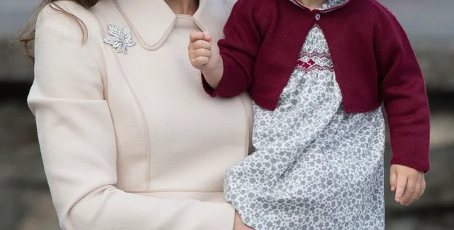 Шарлотта, якій тоді було 16 місяців, була одягнена в сукню з блакитним малюнком, білі колготки, кардиган і червоні черевички.