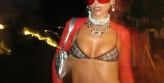 Артистка косовського походження продемонструвала прозорий чорний бюстгальтер з монограмою Gucci в поєднанні (1100 доларів за комплект з бюстгальтера і трусиків) з лавандовими джинсами Gucci з низькою посадкою і кристалічними прикрасами з колекції Resort 2024 бренду. Штани натхненні парою з колекції Gucci Тома Форда 1999 року.