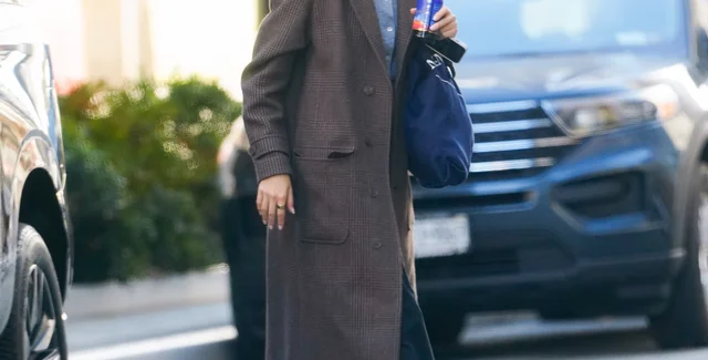 Юна зірка глянців зігрілася в довгому коричневому пальті. Під ним вона одягла сірий светр на ґудзиках, а коричневі сонцезахисні окуляри додали блиску до похмурого образу.