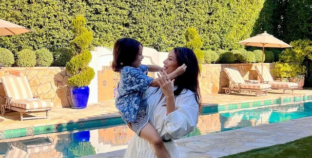 На одному з фото Лонгорія тримає на руках свого пʼятирічного сина. Акторка позує в білій довгій сукні та з розпущеним волоссям. Тим часом Сантьяго приміряв літній яскравий костюмчик. І зіркова мама, і її син посміхалися, дивлячись одне на одного. Вони постали на фоні басейну та пальм, покритих сонячним промінням.