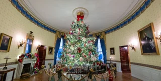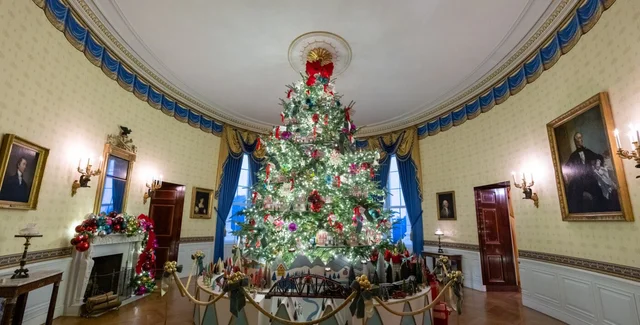 Як завжди, одним із яскравих моментів декору є Блакитна кімната, де виставлена офіційна різдвяна ялинка Білого дому. Цього року деревом є ялиця Фрейзера заввишки 18,5 футів, через яку довелося зняти люстру, щоб ялинка помістилася.
