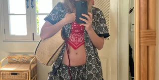 Третій стильний ансамбль складався з червоного топа-футляра, зробленого з бандани, одягненого під чорно-білі шорти з принтом і сорочку в тон. Сьюкі зробила селфі в дзеркалі, додавши до свого образу хустку та коричневу плетену велику сумку.