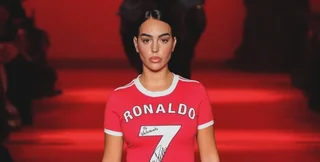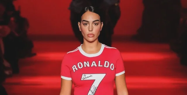 Зірка соцмереж зʼявилася на публіці під час показу Vetements. Вона продемонструвала яскраву червону сукню з прізвищем та номером свого коханого. Волосся Джорджина зібрала в охайний пучок та зробила ефектний вечірній макіяж.