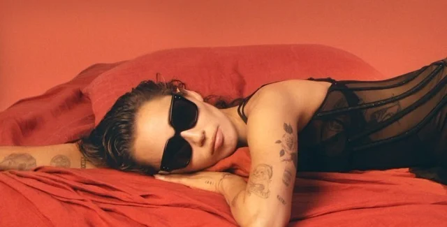 Знаменита співачка рекламує нові сонцезахисні окуляри за $370. Вона має ефектний вигляд у напівпрозорій сукні на ліжку з червоною постіллю.