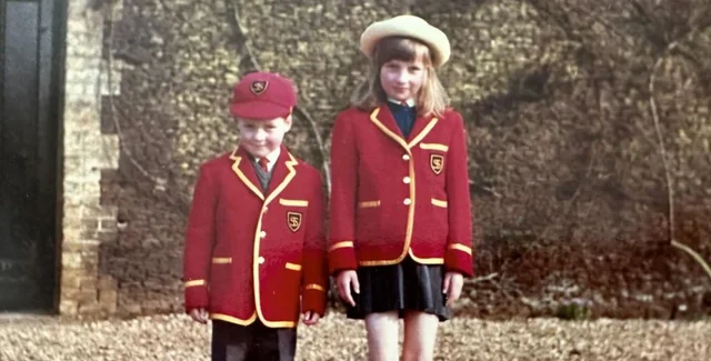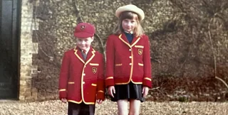 На архівному кадрі маленький Чарльз позує в червоній шкільній формі з чорними шортами та кепкою. Діана, вища за нього майже на голову, постала в схожому образі, додавши до шкільного вбрання світлого капелюшка.
