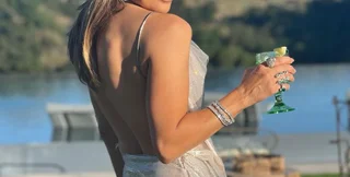 Зліва на ній мінімальний макіяж, завдяки якому шкіра має дуже свіжий і навіть вологий вигляд, довгі золоті сережки і намисто в тон, а також темно-синій джинсовий топ. Її волосся розпущене і пофарбоване в золотистий відтінок.