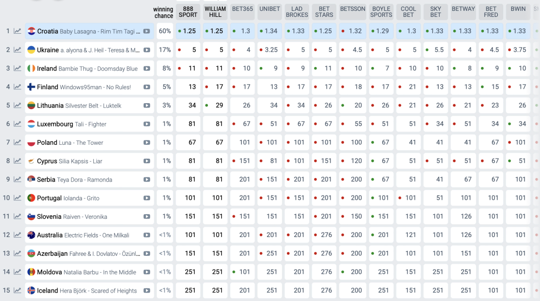Наразі перше місце посідає представник з Хорватії. Співак Baby Lasagna виступить з піснею Rim Tim Tagi Dim і наразі має вірогідність 60% перемогти в шведському Мальме.