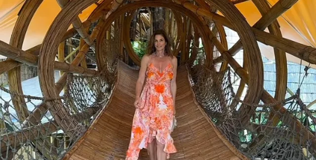Модель виглядала на багато років молодшою за свої 58 років у красивому помаранчевому сарафані з квітковим принтом, який підкреслив її золотисту засмагу і тепле каштанове волосся, коли вона йшла по підвісному мосту. Зірка подіуму, яка почала свою відпустку з Балі, опублікувала знімки своєї вілли, входу в храм, місцевих визначних пам'яток і серця, викладеного на траві з квітів.