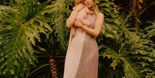 Мати з дочкою позують на тлі тропічного пейзажу. На Сьюкі — пальто з бахромою від Bottega Veneta. Вона притискає доньку до грудей, а її рука — на потилиці у дівчинки.