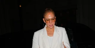 Джей Ло вийшла в білому кроп-топі, підшитому під блейзер в тон із вирізами на рукавах. Співачка поєднала свій образ із джинсовими штанами і туфлями з відкритим носком.