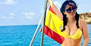 Знаменитість мексиканського походження позувала на фоні жовто-червоного прапора Іспанії, з яким її купальник вдало поєднувався.