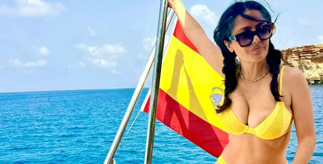 На фото дружина французького мільярдера Франсуа-Анрі Піно постала в яскравому жовтому купальнику на палубі яхти. Волосся Хаєк заплела у дві косички. До іспанського образу акторка додала масивні сонцезахисні окуляри.