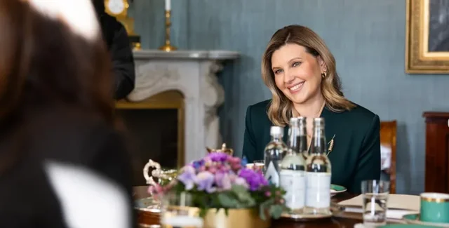 Для закордонного візиту Олена Зеленська одягнула темно-смарагдовий костюм, що складався зі штанів та подовженого піджака з поясом у тон. Символічним доповненням ділового образу стала брошка у вигляді колоска.