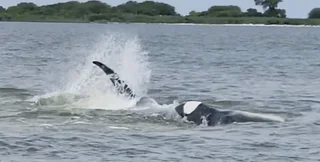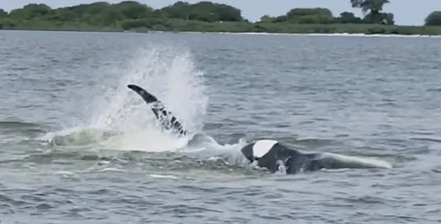 На кадрах видно, як невеликий моторний човен натрапив на малого кита, який б'ється на мілководді. Його плавник і спина вистрибували з води. Відео пригоди на воді туристка поділилася у своєму Facebook.