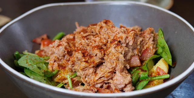 Дієтологиня Кетлін Бенсон радить більш пікантний варіант — тунець із невеликою кількістю майонезу та халапеньйо, який вона їсть із лимон-чичарронами. Для збалансованішого варіанту вона пропонує подавати суміш із цільнозерновими крекерами, хлібом або шматочками болгарського перцю.