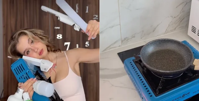 Зокрема, дівчина їжу готує на портативній газовій комфорці.