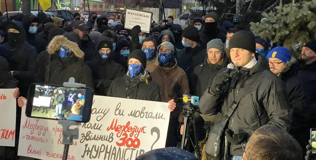 Глава С14 Євген Карась запевняє протестуючих, що Віктор Медведчук зовсім скоро купить телеканал. Також він попросив журналістів "покаятися за те, що працюєте на ФСБ".