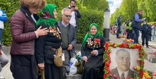 Після перепалки люди оточили ветеранок з портером Жукова, не даючи поліцейським їх забрати, й почали співати радянську пісню "Катюша".