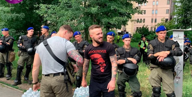 Telegram-канал KlymenkoTime опублікував фото двох учасників акції, один з яких був одягнений у футболку "Адольфкульт" з принтом Адольфа Гітлера, а у другого на руці були татуювання у вигляді свастик.