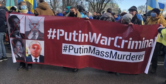 "Скажімо, ні Путіну", "Українці будуть чинити опір", "Путін — масовий вбивця", "Тут горілки немає", — такі написи виднілися на патріотичних банерах, з якими мітингувальники пройшли центром Києва.