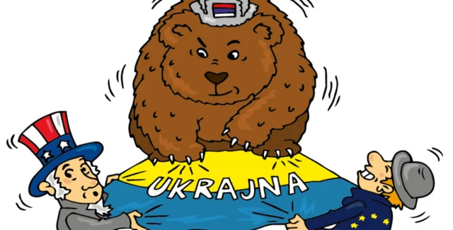 Статтю, присвячену нашій країні, автори доповнили пропагандистською картинкою, на якій Україну розривають російський ведмідь та чоловіки у символіці США та Євросоюзу.