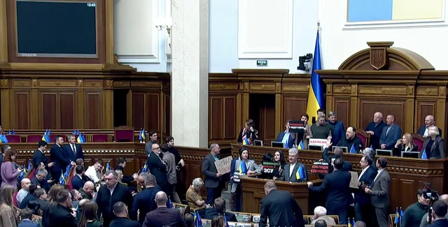 Депутати від "ЄС" заблокували трибуну в Раді перед голосуванням за відставку Галущенка та Гринчук | Фото: Скрин відео