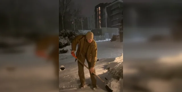 На відео можна побачитиТищенка, що розчищає снігоприбиральною лопатою дорогу біля бізнес-центру.