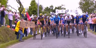 Один з глядачів першого етапу велогонки повернувся в сторону оператора телетрансляції з плакатом. До велосипедистів він був спиною. Спортсмен Тоні Мартін був затиснутий з одного боку іншими велосипедистами, а з іншого — глядачами. Тому він впав, що спричинило ланцюгову реакцію і падіння десятків спортсменів.