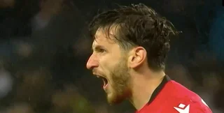 30. Довбик відходить глибоко на свою половину поля, щоб хоч би зачепитися за м'яч. Заробляє штрафний за блокування.
