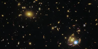 "Галактика, яку можна побачити тричі на знімку, — це досить рідкісне явище", — кажуть астрономи Габбла. "Галактика з'являється один раз у вигляді дуги праворуч від яскравої зірки і ще 2 рази у вигляді крапок над зіркою та праворуч від неї".