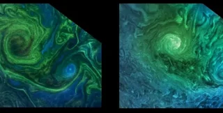 "Коли я побачила фотографії турбулентності навколо циклонів на Юпітері з усіма нитками та дрібними завихреннями, це нагадало мені турбулентність, яку ви бачите в земному океані навколо виру", — каже океанологиня Лія Сігельман із Інститут океанографії ім. Скриппса в Сан-Дієго, штат Каліфорнія. Це особливо видно на супутникових знімках цвітіння планктону.