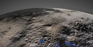 Крижаний вулканічний регіон Плутона можна побачити на цьому знімку, зробленому космічним кораблем NASA "Нові горизонти". Сині позначки показують, як могли відбуватися вулканічні процеси в минулому