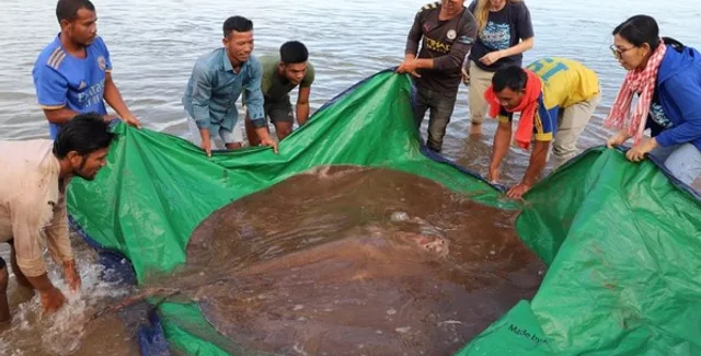 Після того, як рибалки витягли гігантського ската вони повідомили про свою знахідку групі вчених з Університету Штату Невада, США, які працюють у Камбоджі та вивчають річку Меконг.