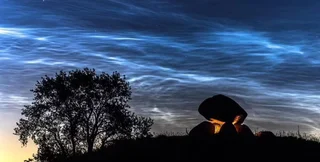 Сріблясті хмари складаються з кристаликів льоду, які починають світитися в сутінках, коли сонце зникло за горизонтом, але його останні промені все ще освітлюють небо.