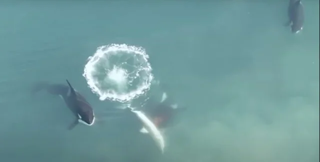 Буквально за секунди з глибини океану виринула п'ята косатка, але не одна. Носом вона також виштовхнула із води триметрову білу акулу. Блискавичним стрибком косатка перевернула акулу на бік і схопила її за грудний плавець. Потім до полювання приєдналася ще одна косатка, яка спритно вхопила акулу за хвіст і потягла колись могутнього мисливця океану в прірву.
