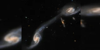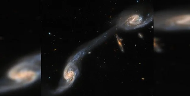 На зображенні телескопа Габбл на передньому плані можна побачити дві галактики, які з'єднані своєрідним "галактичним хвостом", а третя галактика знаходиться на задньому плані. Цією галактичною сполукою є потік із газу та пилу, який створив гравітаційну взаємодію двох галактик. Тобто вони поступово притягуються одна до одної.
