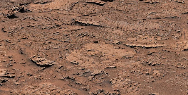 Марсохід Curiosity використав свою камеру Mastcam, щоб сфотографувати цю панораму поверхні Марса. Рифлені текстури гірських порід, знайдені в цій області, є найяскравішим свідченням того, що марсохід виявив ознаки існування води та хвиль у стародавньому минулому Марса.