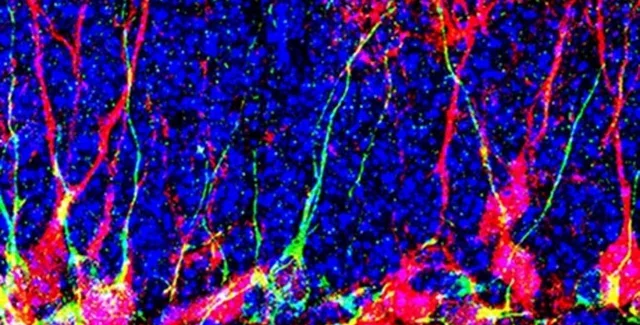 Новоутворені нейрони (червоні) у зубчастій звивині з ядрами клітин (сині) та маркер незрілих нейронів (зелені) | Фото: Knobloch Lab