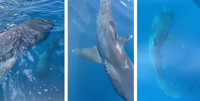 Обидві акули були на поверхні, приблизно за 45-60 метрів від рибальського човна, коли їх помітили люди. Велика акула досягала близько 4,6 метра у довжину, тоді як друга особина — 3,7 метра, останній був ідентифікований як самець. На відео видно, як менша особина кружляє глибше під водою, тоді як велика вільно плавала на поверхні та без страху підпливала до рибальського човна.