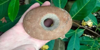 Про це свідчить незначний знос у вузькому місці отвору в центрі. Невеликі відколи навколо нього може вказувати на виготовлення за допомогою техніки, відомої як проколювання, а не свердління.