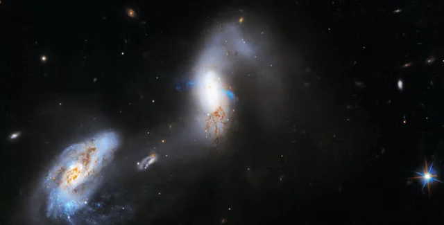 На новому знімку телескопа Габбл показані дві галактики, розташовані на відстані майже 500 млн світлових років від нас. На задньому плані також можна розрізнити й інші більш далекі галактики різної форми.