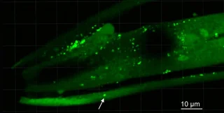 Яскраві точки вказують на наявність скупчень α-синуклеїну всередині головок черв'яків, які харчувалися бактеріями | Фото: Huynh et al., Front. Cell. Infect. Microbiol., 2023