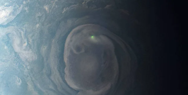 Під час чергового зближення апарат NASA відобразив зелений спалах, який виник від удару блискавки всередині великого атмосферного вихору поруч із північним полюсом газового гіганта. Це зображення було зроблено з відстані 32 тисячі км над хмарами Юпітера.