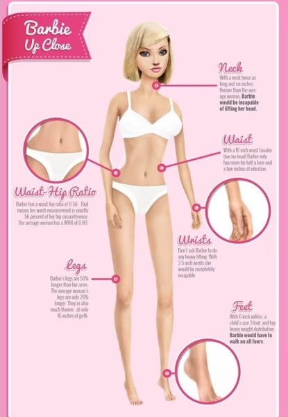 При цьому талія Барбі становила б близько 40 сантиметрів, що можна порівняти з талією дитини — насправді це також викликало б проблеми у реальної жінки. Фактично це означає, що місця в черевній порожнині вистачило б лише на половину печінки та кілька сантиметрів кишківника.