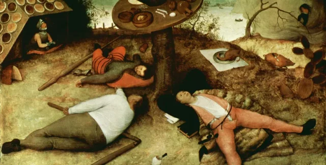 Візуальність знаходить свій апогей у зображенні Пітера Брейгеля, фламандського художника 16-го століття. Його шедевр 1567 року, "Країна ледарів", увічнює трьох лежачих чоловіків, які отримують вино, що каскадом ллється з дерева до їхніх ротів. Млинці встеляють дах, а напівз'їдене яйце в'ється на маленьких ніжках.